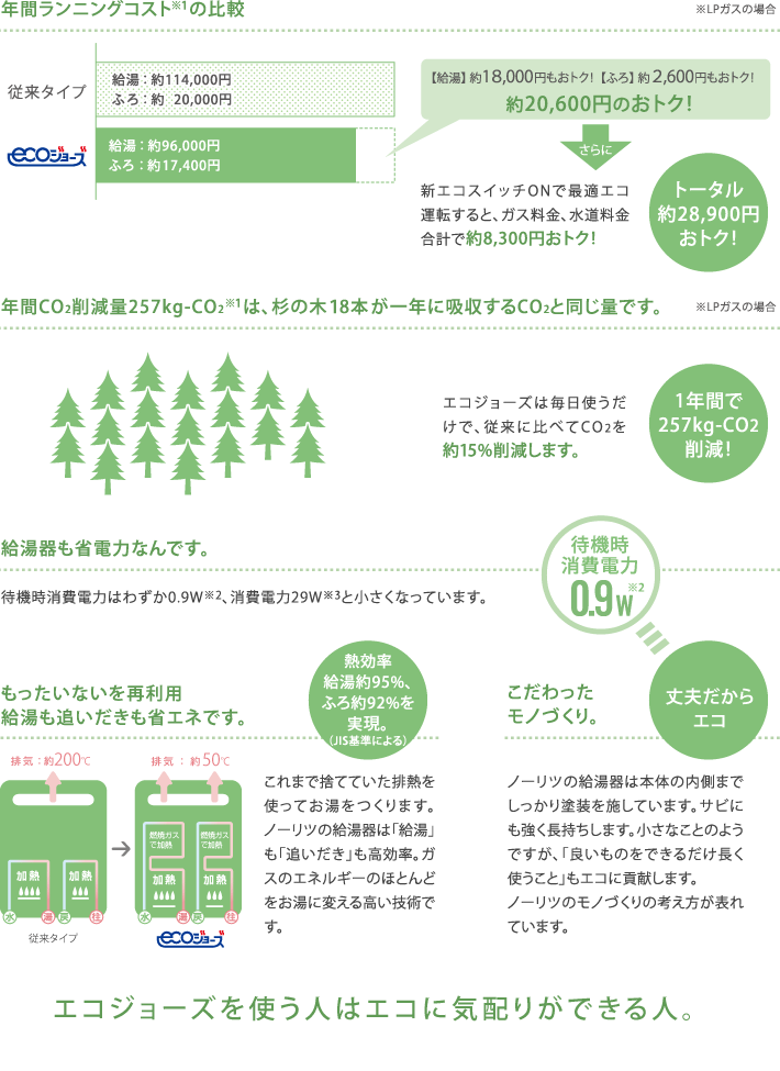 ノーリツのエコジョーズ給湯器は、ガスの使用量を減らせ、排出するCO2も少なくできます。