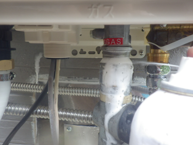 ガスの配管をつないだあとは必ずガス漏れチェックをします。