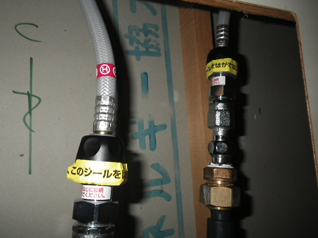 水栓本体を固定致しましたら、湯・水を繋げ直しまして